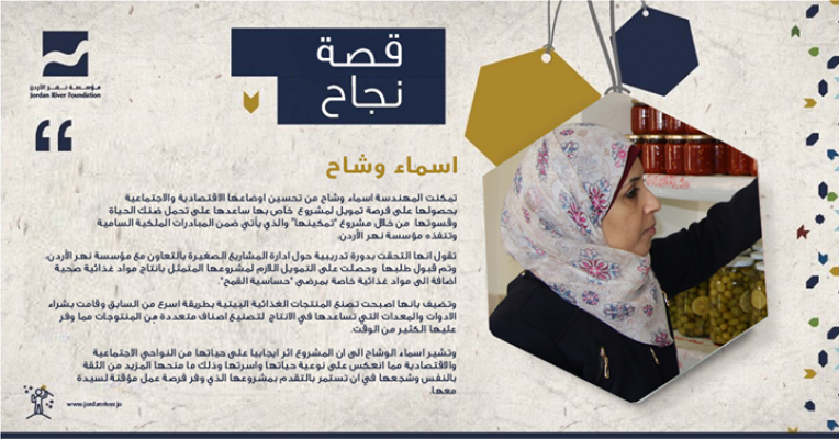 اسماء وشاح: المراة قادرة على صناعة الفرصة لتحقيق الاهداف تمكنت المهندسة اسماء وشاح من تحسين اوضاعها الاقتصادية والاجتماعية بحصولها على فرصة تمويل لمشروع خاص بها ساعدها على تحمل ضنك الحياة وقسوتها من خلال مشروع ”تمكينها“ والذي يأتي ضمن المبادرات الملكية السامية وتنفذه مؤسسة نهر الأردن. تقول انها التحقت بدورة تدريبية حول ادارة المشاريع الصغيرة بالتعاون مع مؤسسة نهر الأردن، وتم قبول طلبها وحصلت على التمويل اللازم لمشروعها المتمثل بانتاج مواد غذائية صحية اضافة الى مواد غذائية خاصة بمرضى "حساسية القمح". وتضيف بانها اصبحت تصنع المنتجات الغذائية البيتية بطريقة اسرع من السابق وقامت بشراء الادوات والمعدات التي تساعدها في الانتاج لتصنيع اصناف متعددة من المنتوجات مما وفر عليها الكثير من الوقت. وتشير اسماء الوشاح الى ان المشروع اثر ايجابيا على حياتها من النواحي الاجتماعية والاقتصادية مما انعكس على نوعية حياتها واسرتها وذلك ما منحها المزيد من الثقة بالنفس وشجعها في ان تستمر بالتقدم بمشروعها الذي وفر فرصة عمل مؤقتة لسيدة معها. #حب_الأردن